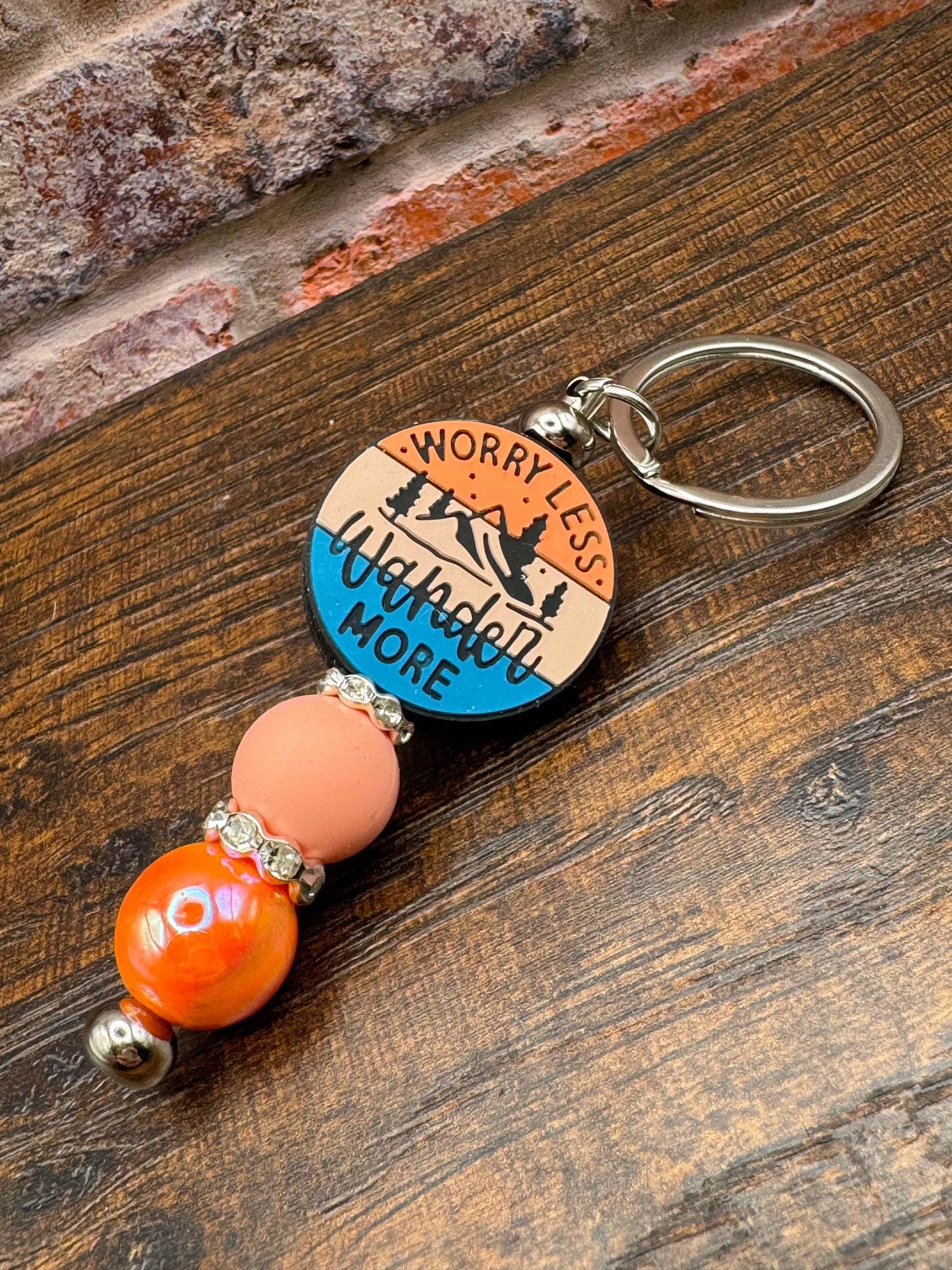 This keyring includes silicone and acrylic beads with a motivational saying